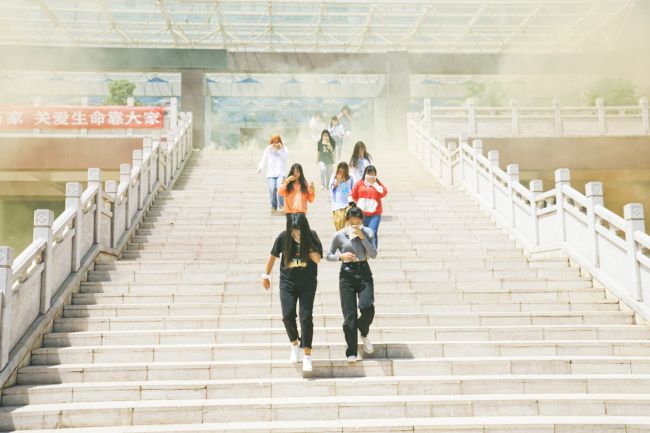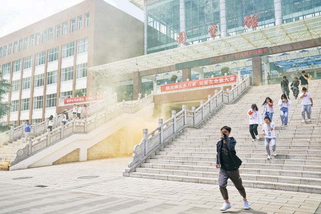 随着图书馆综合体门口仿真烟雾四起,消防演练正式拉开帷幕。警报响起后,图书馆综合体的老师们和大学生服务团的同学们迅速行动,在有效的时间内有序撤离,到达指定“避难场所”——知识广场。