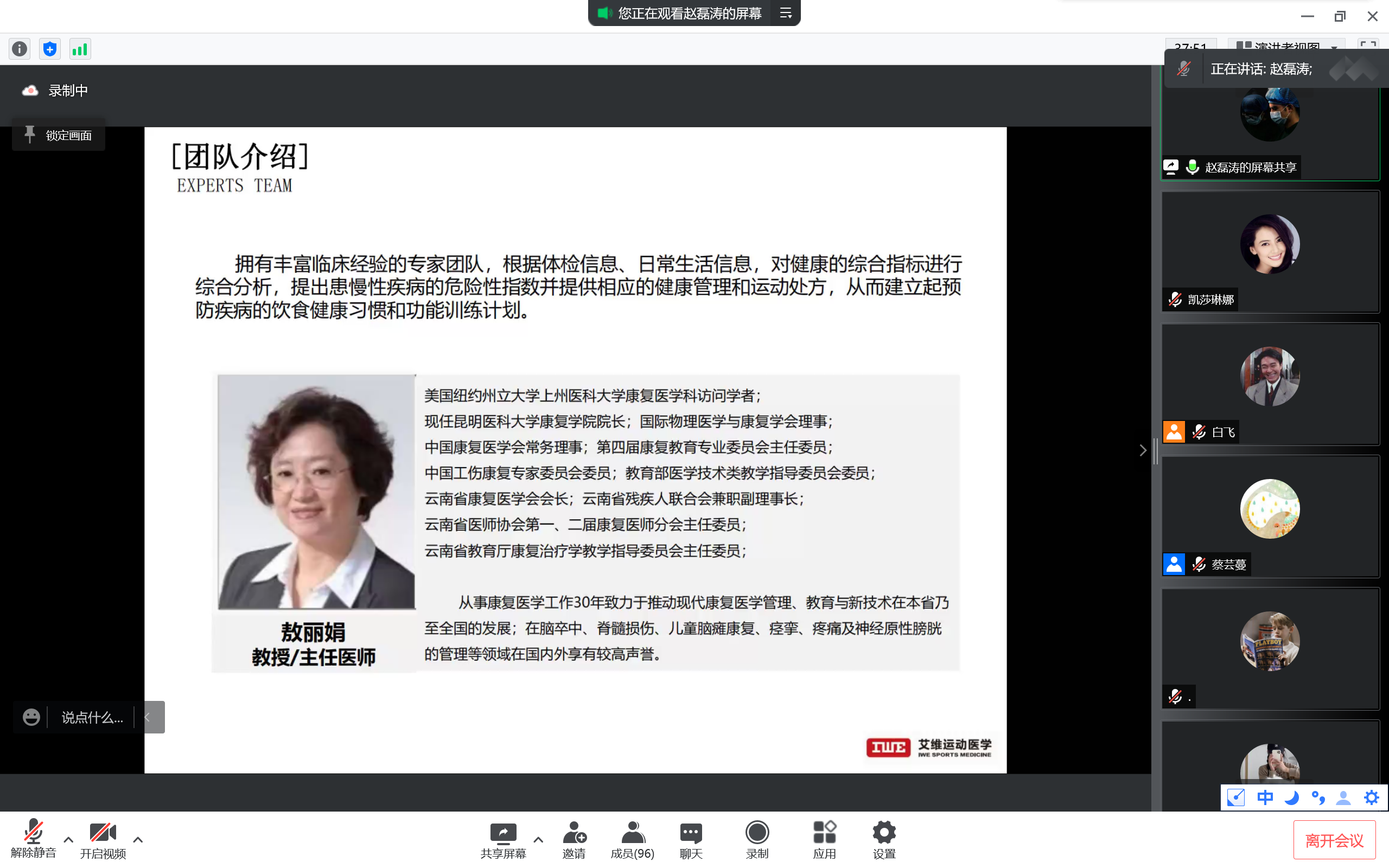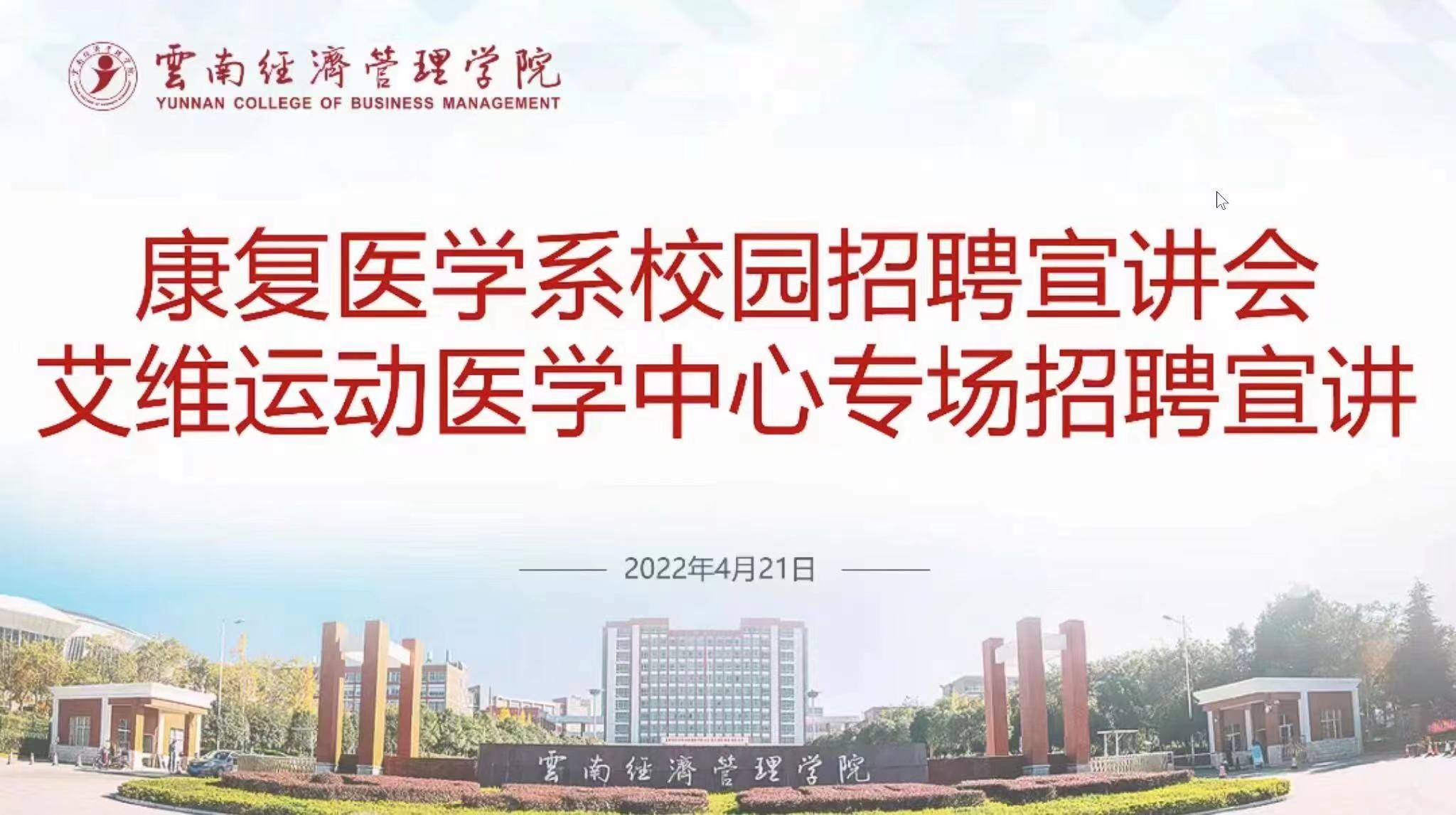 为拓宽应届毕业生在疫情期间就业渠道,向毕业生提供更多就业机会和精准就业服务,云南经济管理学院医学院康复医学系于2022年4月21日通过腾讯会议举办了艾维运动医学中心专场校园招聘(线上)宣讲会。本次会议邀请了昆明艾维投资集团的相关负责人进行宣讲,由康复医学系系主任蔡芸蔓以及白飞老师共同主持。参加本次会议的有康复医学系2022届康复治疗学、康复治疗技术、中医康复技术毕业生及系部老师,共240余人。本次会议主要内容包括:艾维公司情况介绍(企业核心、文化、产品、业务及未来发展方向),招聘岗位职责要求,答疑互动等。