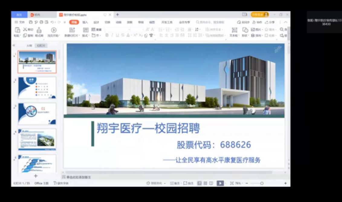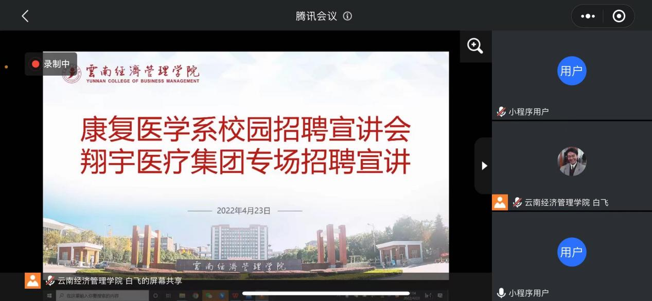 为切实做好我系2022届毕业生的就业工作,落实为学生办实事,最大程度地降低疫情对毕业生求职的影响,系部多措并举全面开展岗位推荐、就业帮扶等工作。2022年4月23日11:00-13:00云南经济管理学院医学院康复医学系线上举行了2022届康复治疗学、康复治疗技术、中医康复技术专业就业第二次招聘宣讲会。学院特邀请翔宇医疗集团西南区总经理何总监、宣传部部长张阳老师、云南区总经理赵振忠老师,人事部主管赵冰冰老师进行线上宣讲,岗位涉及康复治疗师、康复器械销售及学术经理,整个招聘宣讲会采用腾讯会议的方式进行??蹈匆窖迪抵魅尾誊柯鲜?、教学秘书白飞老师、各班辅导员及班主任和全体毕业生全程参与线上会议,并与用人单位在线亲切沟通,协调解决学生求职面临的困难。