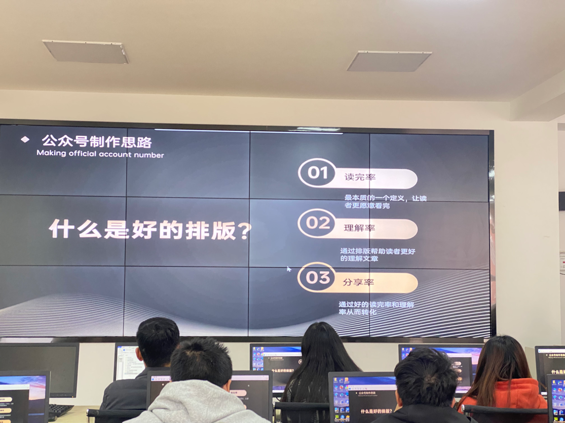 此次授课,黄老师为大家说明了什么样的公众号排版才会吸引读者,进而提高读完率以及增加IP自身的品牌效应,让大家在日后运营自己账号时找到了正确的方向。同时,针对不同的短视频风格,黄老师让大家明白了新媒体下短视频的剪辑必须要节奏紧凑,同时具有互动性及实效性。以及培养了大家在视频拍摄及剪辑中的分镜意识,强化视频中的细节表现,能够吸引观众的注意力,最终得以完成好的作品。大家在一片欢声笑语中既学到了满满的干货,同时还不失课堂的活跃度,是一次非常成功的培训,希望大家能带着自己的收获,把经验运用到实际中,期待营销中心的同学们拿出优质的作品!