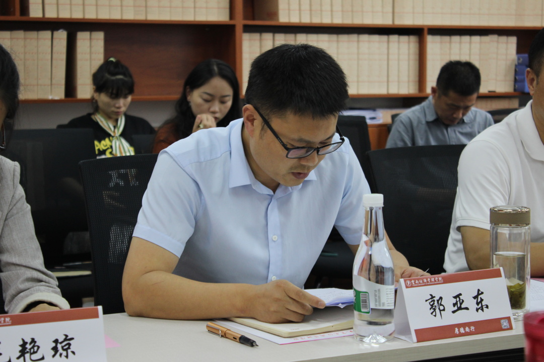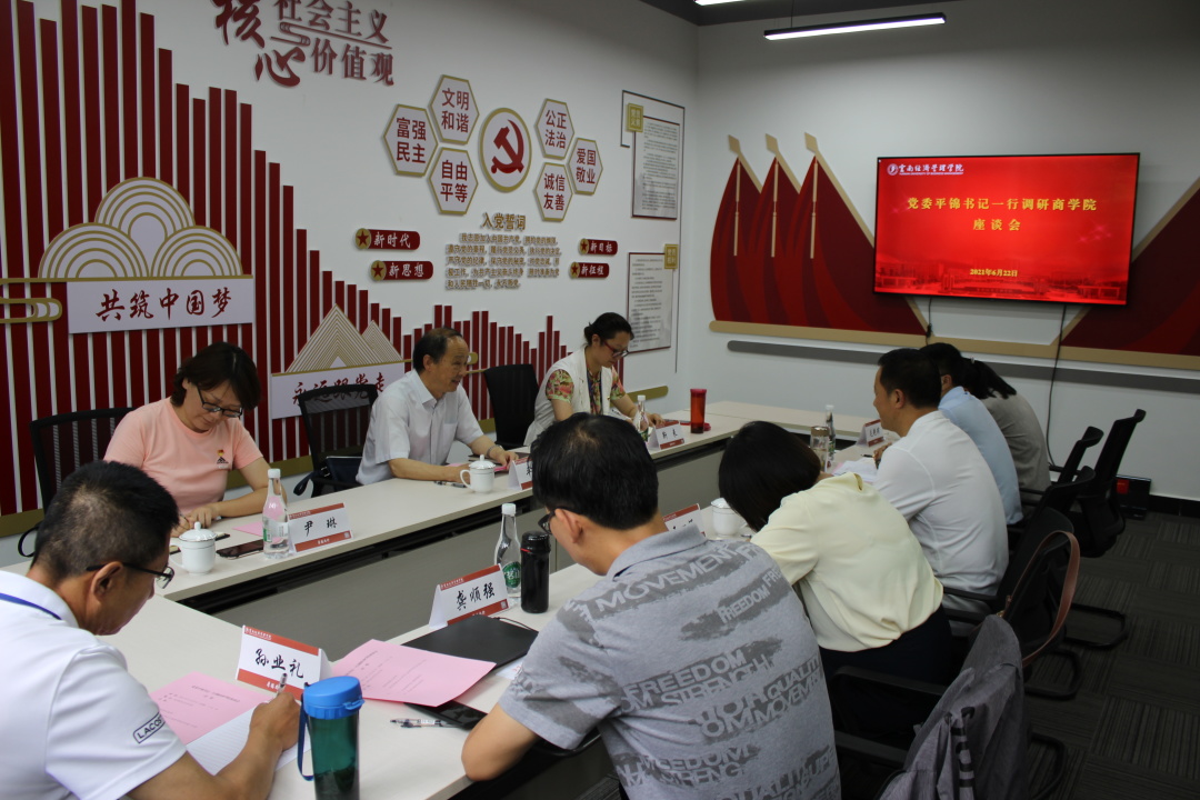 6月21日下午,学院党委书记平锦到商学院调研指导工作,党委统战部部长、组织部副部长靳来,党委组织部党务科科长尹琳陪同,商学院院长李严峰,党总支书记、副院长郭亚东,执行院长王一涵,系主任、支部书记、教师教师代表、辅导员代表参加座谈。