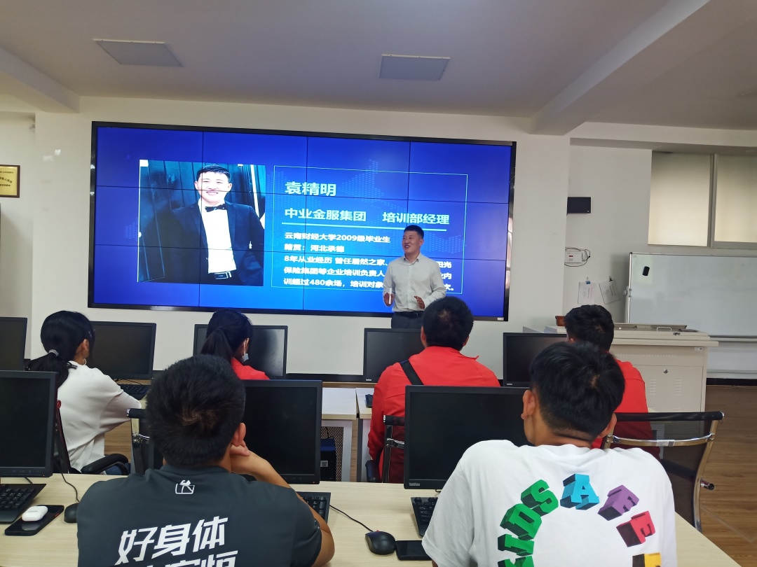 中业金服培训部经理袁精明提出萌新们初到大学,有各种期待,也有各种迷茫,但现实是不允许幻想的,想成为什么样的人,关键要靠自己的努力。袁精明老师向同学们提出了两个问题:这个社会需要什么样的人才?现在的我们需要做什么?针对这两个问题,袁老师进行详细的阐述。社会需要的人才是具有超强的专业能力,能与本职工作挂钩,有较强的工作能力的人,既在职场上有目标感,专业化,学习力的人。同时职场精英身上具备的素质也是需要同学们努力学习的。袁老师强调,现阶段同学们拥有成本最低的学习机会,机会最多的社交活动,要努力学习,参加各种有用的活动,拓宽交友范围。袁老师建议同学们积极融入群体生活中,学会竞争,保持良好的习惯,同时也给同学们推荐了几个有利于学习软件。袁精明老师送给萌新们一句话“乾坤未定,你我皆是黑马,胜负未分,你我皆有可能,山高路远,我们江湖再见!”