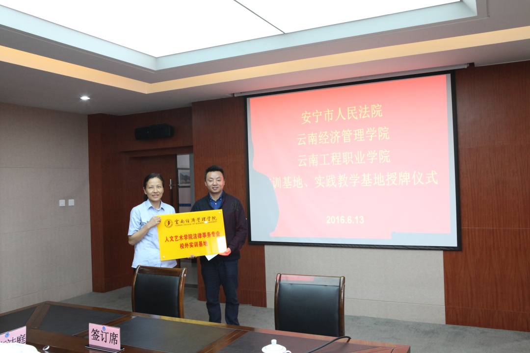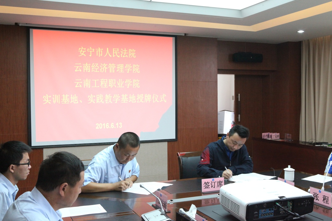 2016年6月,我校与安宁市人民法院签署校外实习实训基地协议,并完成挂牌仪式。