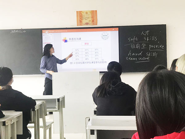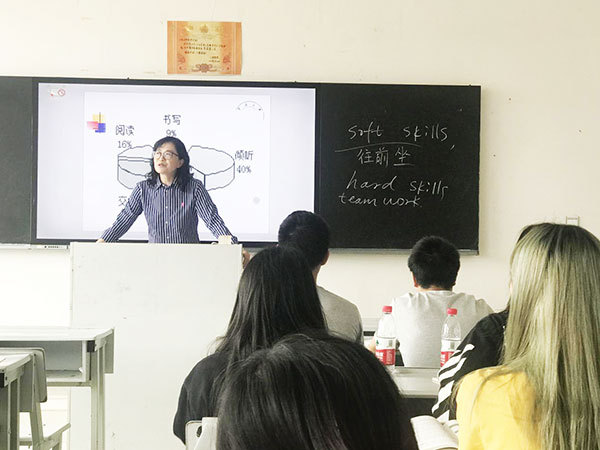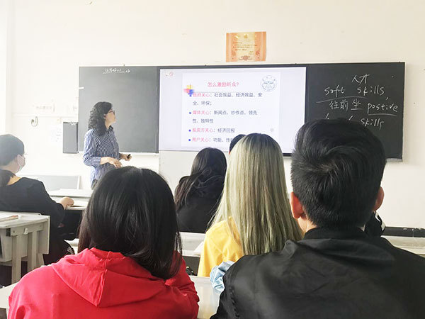 曾萍副教授在授课中流畅地使用中英文交互表达,启发同学们思考商科的软技能softskill的重要性,softskill主要包括倾听、沟通、自信、项目时间管理、团队合作、体谅他人、表示感激、领导能力、演说技巧及业务知识等能力。曾老师列举了自己在美国麻省理工学院斯隆管理学院(MIT Sloan)做访问学者期间,学校通过五场公众演讲来训练同学们的沟通能力,并通过外企的工作案例引领同学们体会不同文化背景下的沟通管理特色,然后由浅入深导入和诠释沟通的相关理论及技巧。